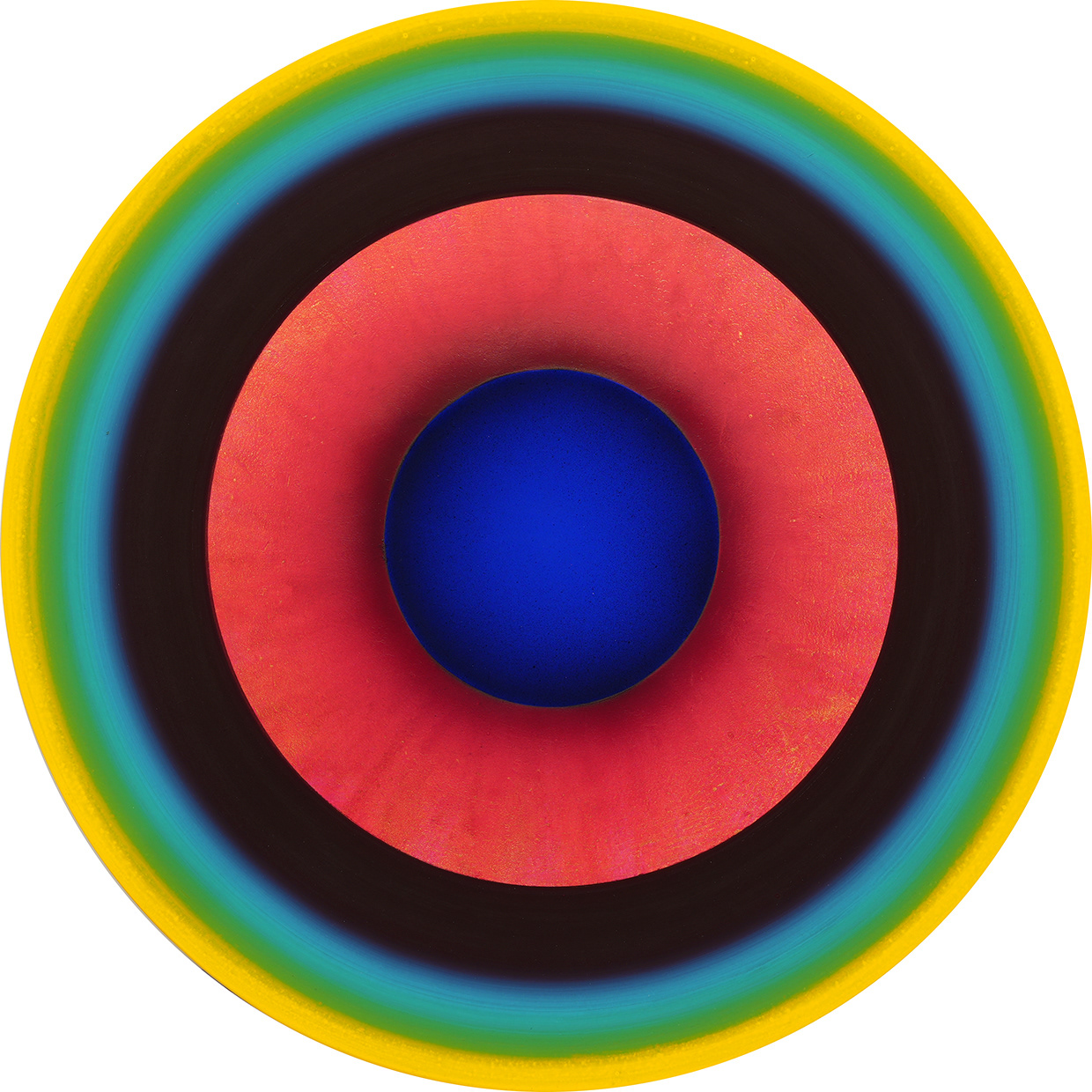 Yellow, Red, Blue, Black, White II, 2023, egg tempera and casein on wood, 100 cm Ø