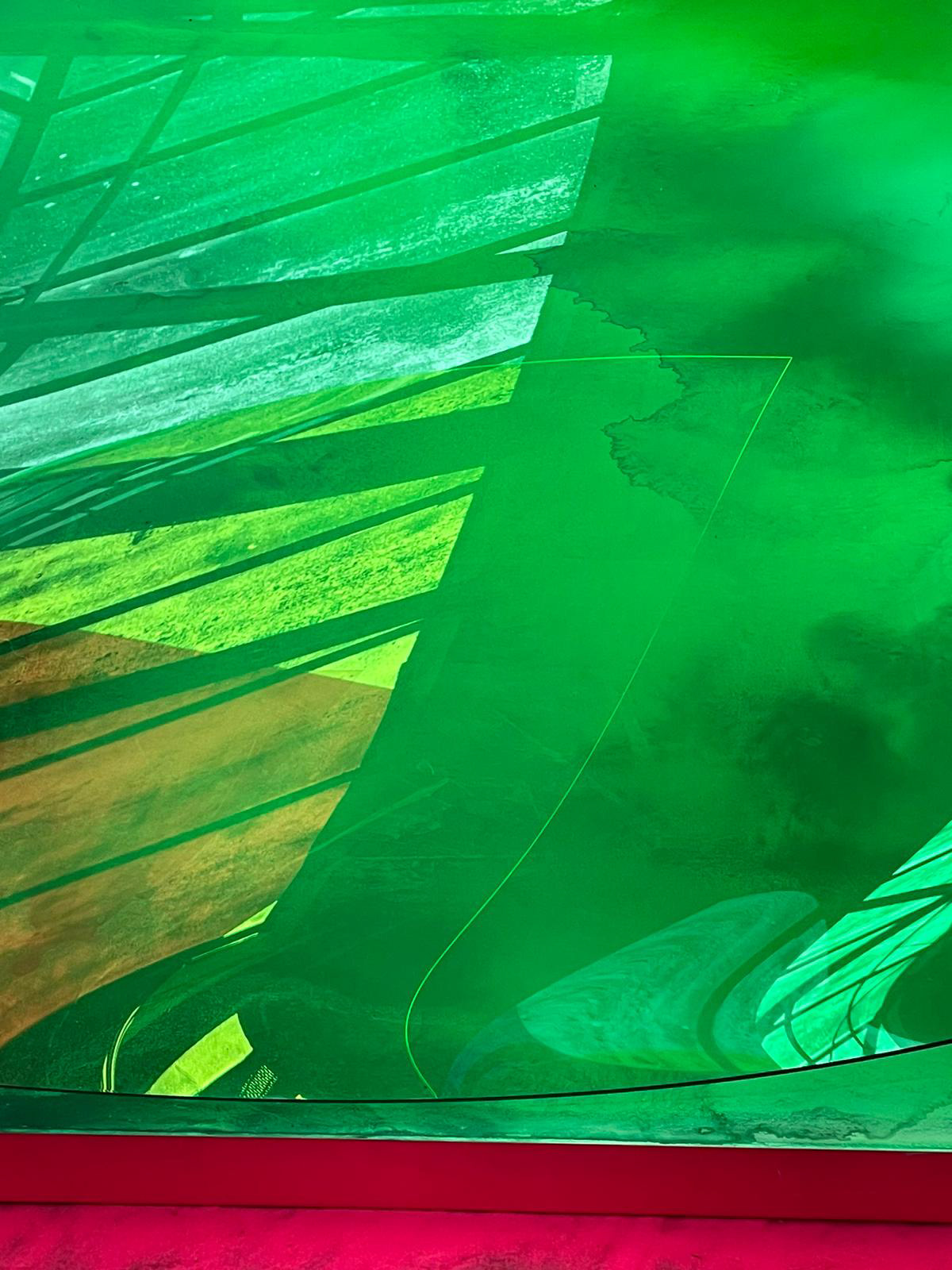 Transfiguration, 2021, coloured plexiglass, egg tempera on wood, pigment, steel cable, 173 x 126 x 470 cm. Big Art, Hembrugterrein